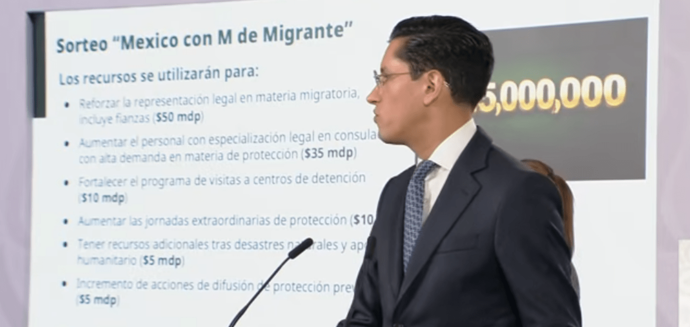 El subsecretario para América del Norte de la Secretaría de Relaciones Exteriores (SRE), Roberto Velazco, informó que los 115 millones de pesos recaudados a través del sorteo México con M de Migrante se destinarán principalmente a fortalecer la representación legal de personas migrantes mexicanas en la red consular, con énfasis en asuntos migratorios.