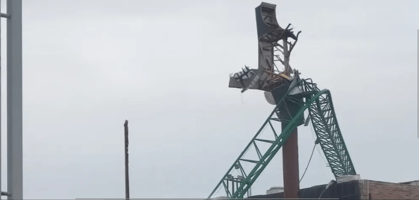 El funcionario confirmó que no se reportaron personas lesionadas tras el desplome de la maquinaria; sin embargo, tres vehículos y un restaurante resultaron con daños materiales.