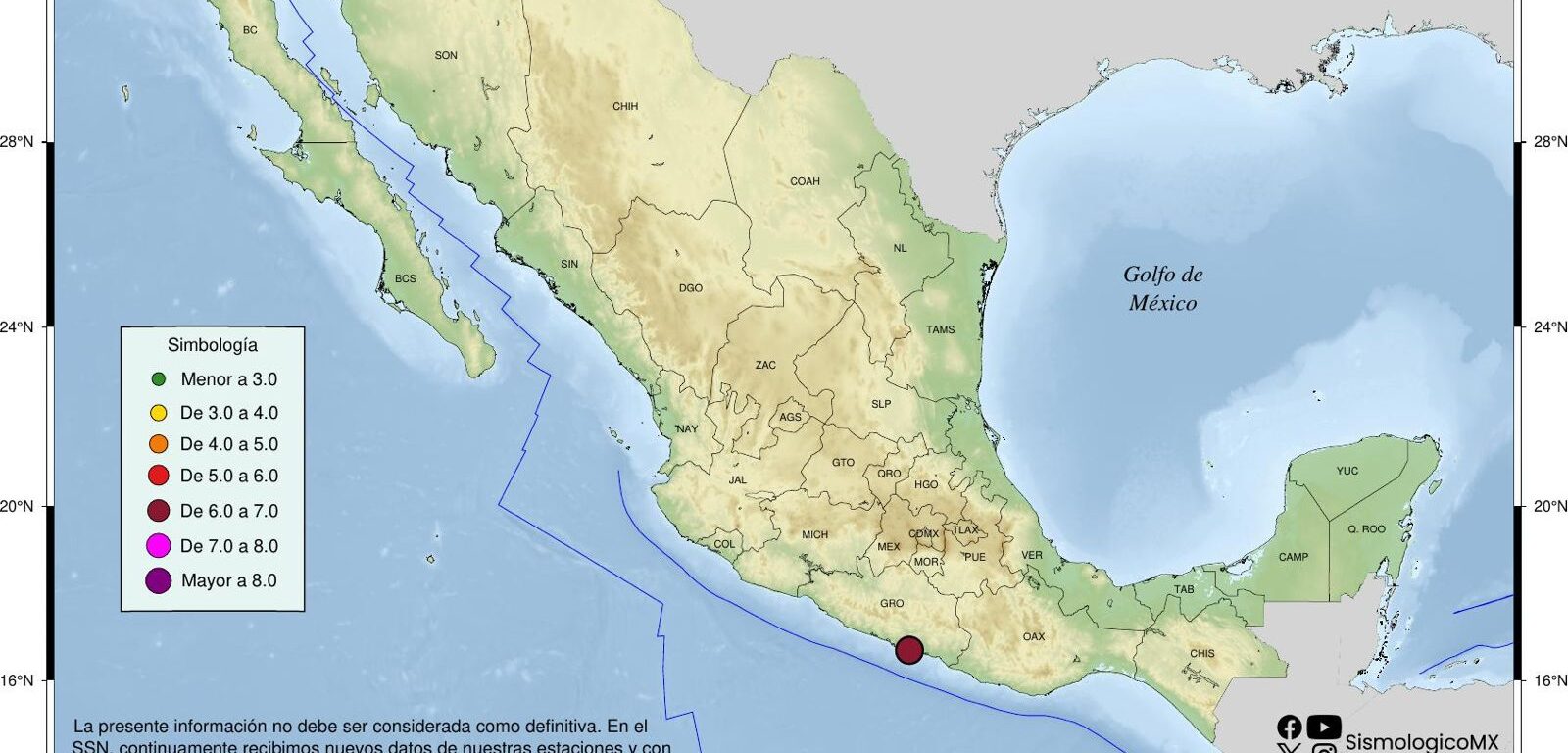 A las 7.58 hrs se registró un sismo con reporte preliminar de magnitud 6.5 con una profundidad de 10 km a 15 km al suroeste de San Marcos, Guerrero.