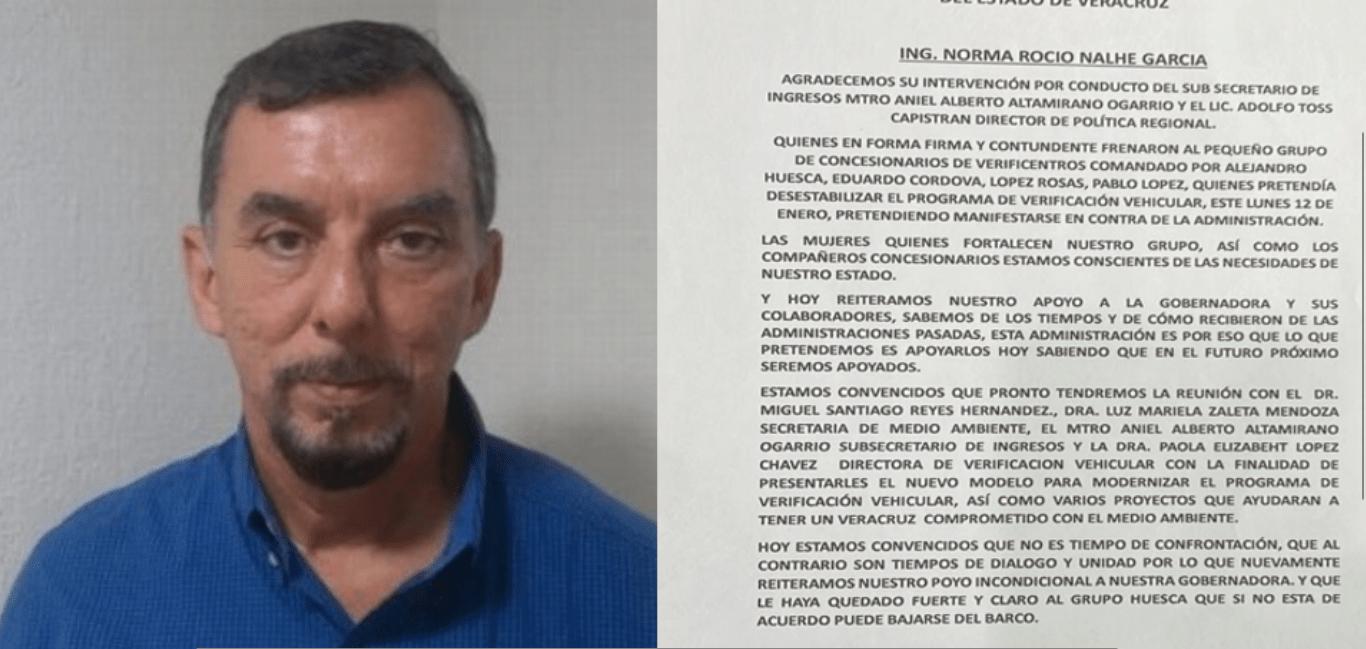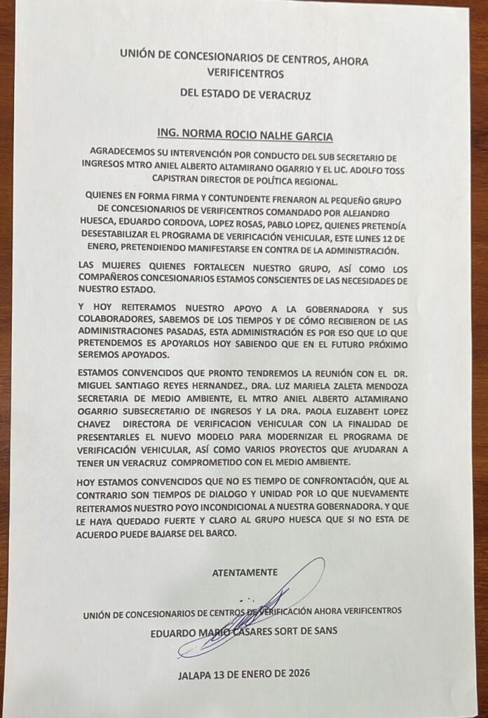 El documento fue firmado por Eduardo Mario Casares Sort de Sans, en representación de la Unión de Concesionarios de Centros de Verificación Vehicular del Estado de Veracruz.