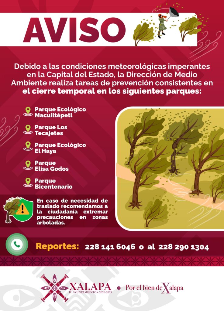 El Ayuntamiento de Xalapa reiteró que estas acciones forman parte de una estrategia preventiva y que los parques serán reabiertos una vez que las condiciones meteorológicas lo permitan, priorizando siempre la seguridad de las y los xalapeños.