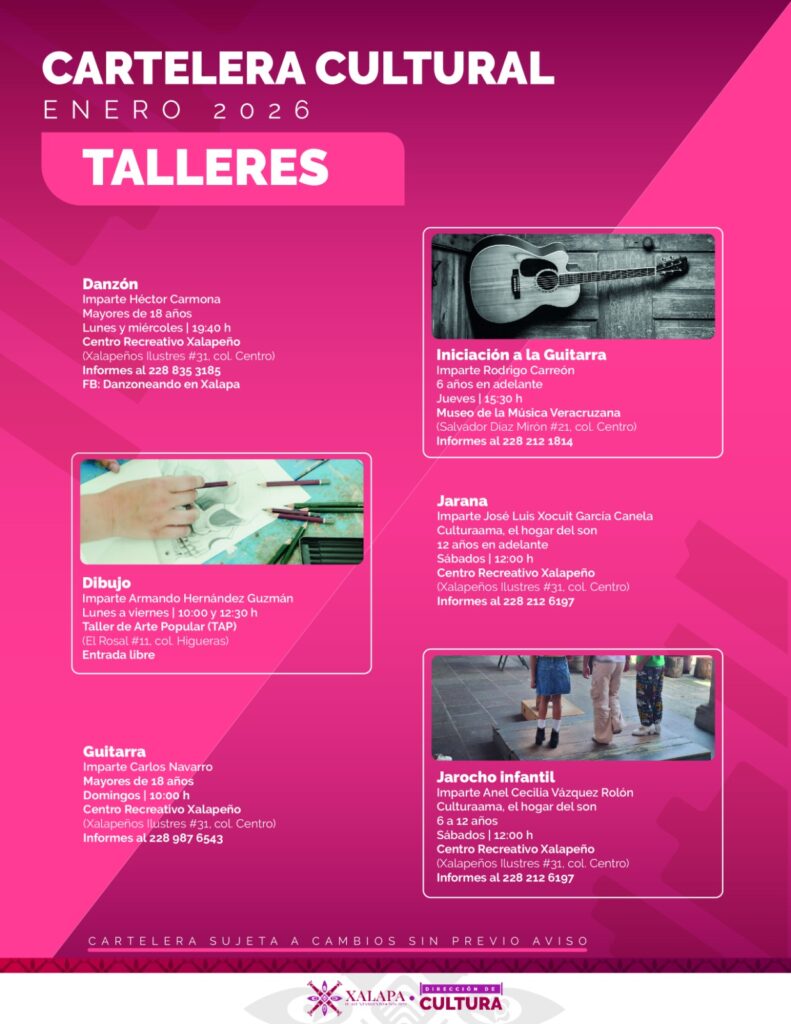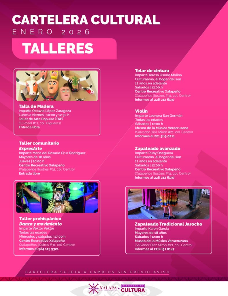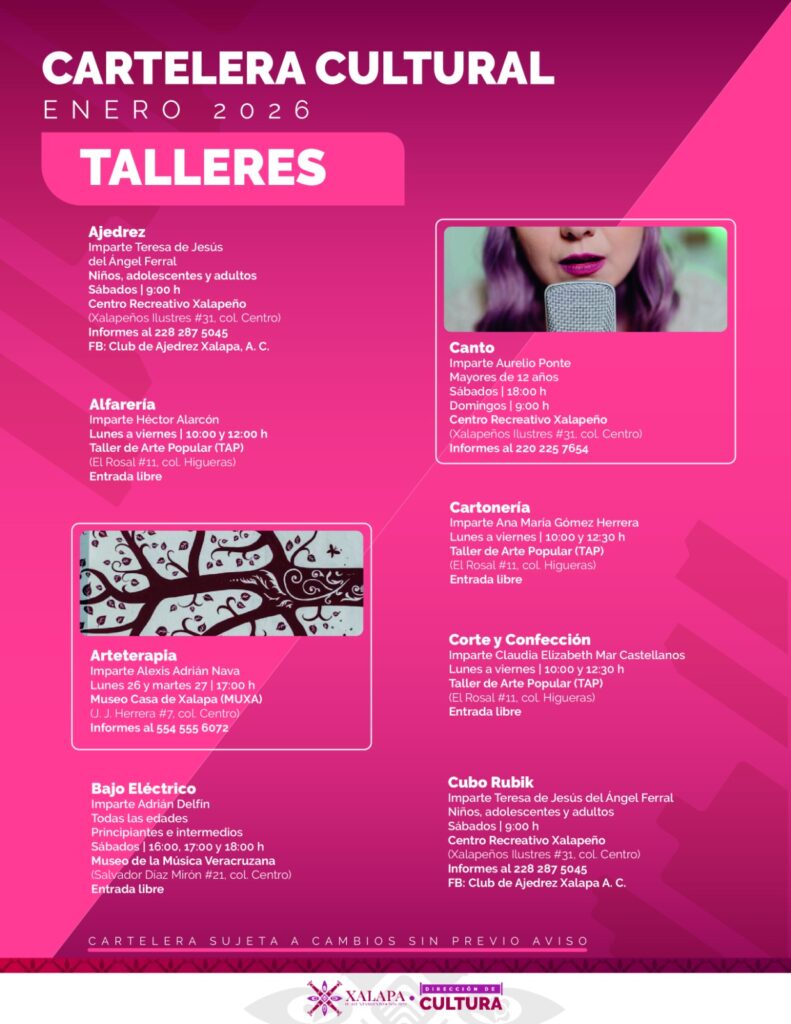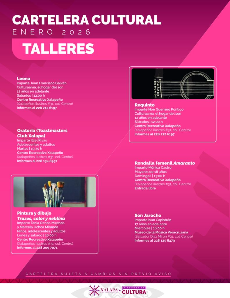 Xalapa, Ver., 16 de enero de 2026.- Talleres, cine, música y más incluye la agenda cultural que organiza el Ayuntamiento de Xalapa para recreación de las familias, en distintos recintos y espacios públicos.