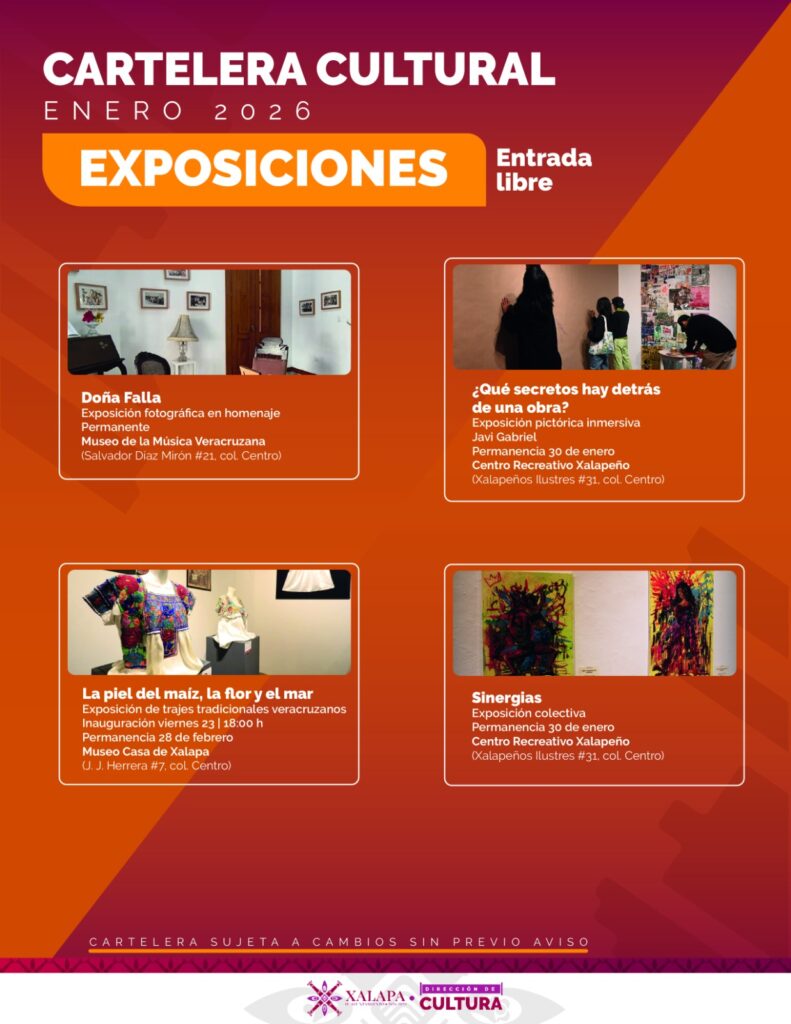En el CRX se tendrá la exposición “¿Qué secretos hay detrás de una obra?”, y el viernes 23 de enero, a las 18:00 horas, se inaugurará la exposición “La piel del maíz, la flor y el mar”, muestra de indumentaria tradicional veracruzana, en el Museo Casa de Xalapa.