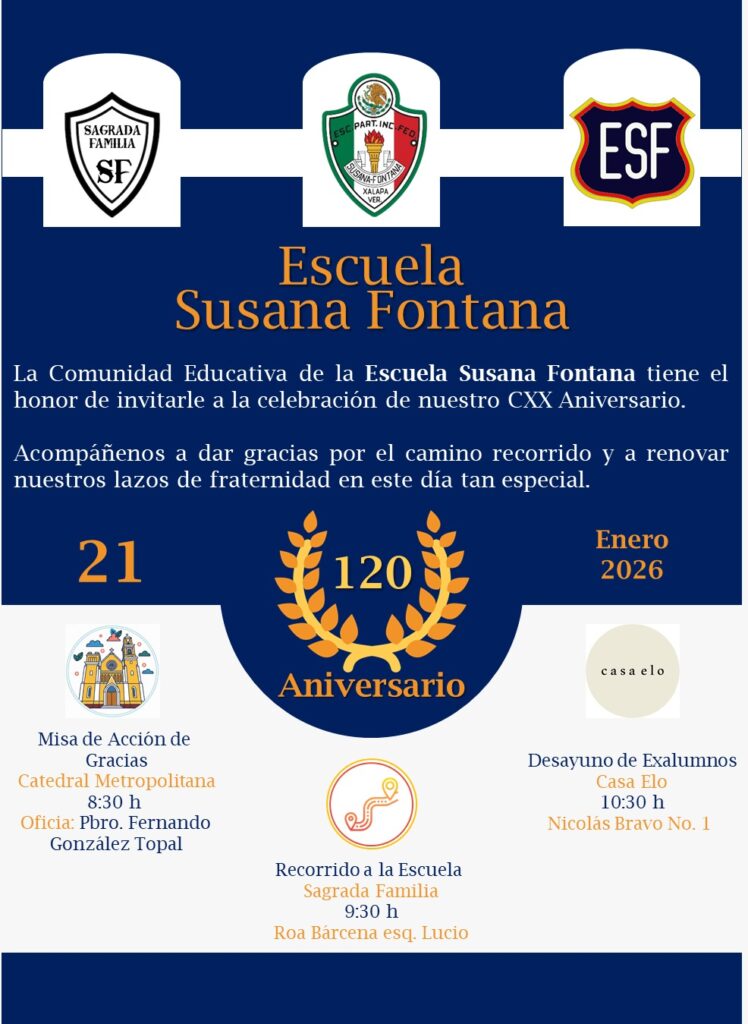 Para conmemorar el 120 aniversario de la fundación de la escuela primaria mixta Sagrada Familia —luego Susana Fontana—, el próximo miércoles 21 de enero de 2026 a las 8:30 am se celebrará una eucaristía en la Catedral de Xalapa, oficiada por el sacerdote y profesor normalista Fernando González Topal, responsable de la pastoral educativa de la arquidiócesis. Posteriormente, se realizará un recorrido por las sedes de la escuela, culminando con un desayuno.