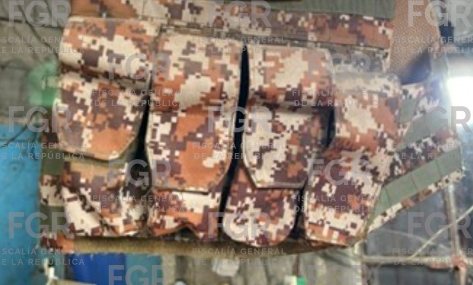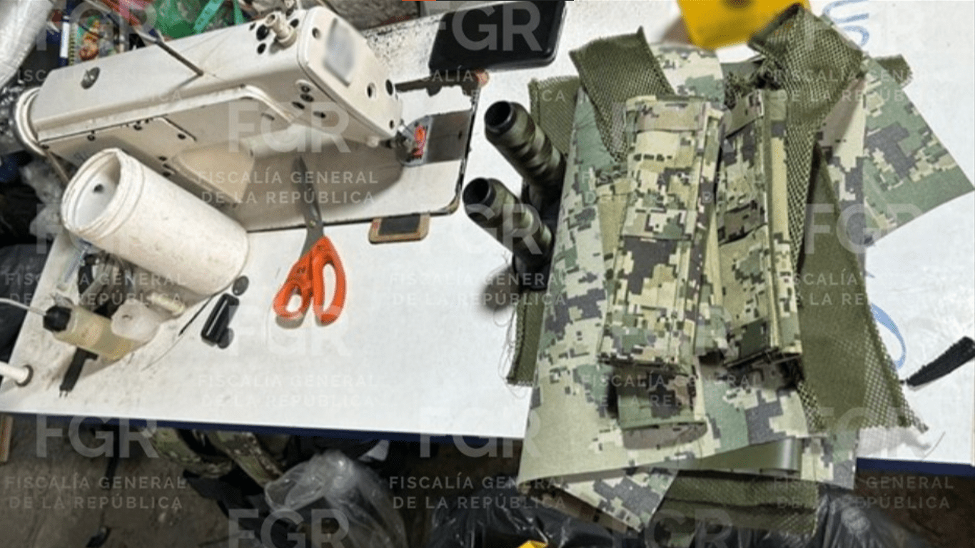 Las autoridades que conforman el Gabinete de Seguridad del Gobierno de México aseguraron seis máquinas de coser tipo industrial, una máquina cortadora de tela, seis chalecos verdes camuflados, seis chalecos color negro, algunos con insignias de la Policía Estatal, un chaleco verde con café camuflado, un rollo de tela color café con verde y rojo camuflado, un tramo de tela bordado con el nombre de una institución de las Fuerzas Armadas de México.