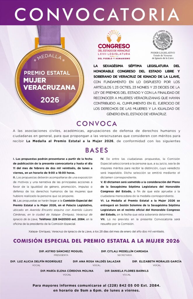 Xalapa, Ver., 29 de enero de 2026.- Con el objetivo de reconocer a las veracruzanas destacadas por su trayectoria de vida, obra, méritos académicos, científicos, artísticos, literarios o de otra índole, o que desde cualquier ámbito de acción hayan contribuido al cumplimiento en el ejercicio de los derechos de las mujeres y la igualdad de género en el estado, la Comisión Especial del Premio Estatal a la Mujer 2026 dio a conocer la convocatoria para elegir a la acreedora a esta distinción que el Congreso del Estado otorga anualmente.