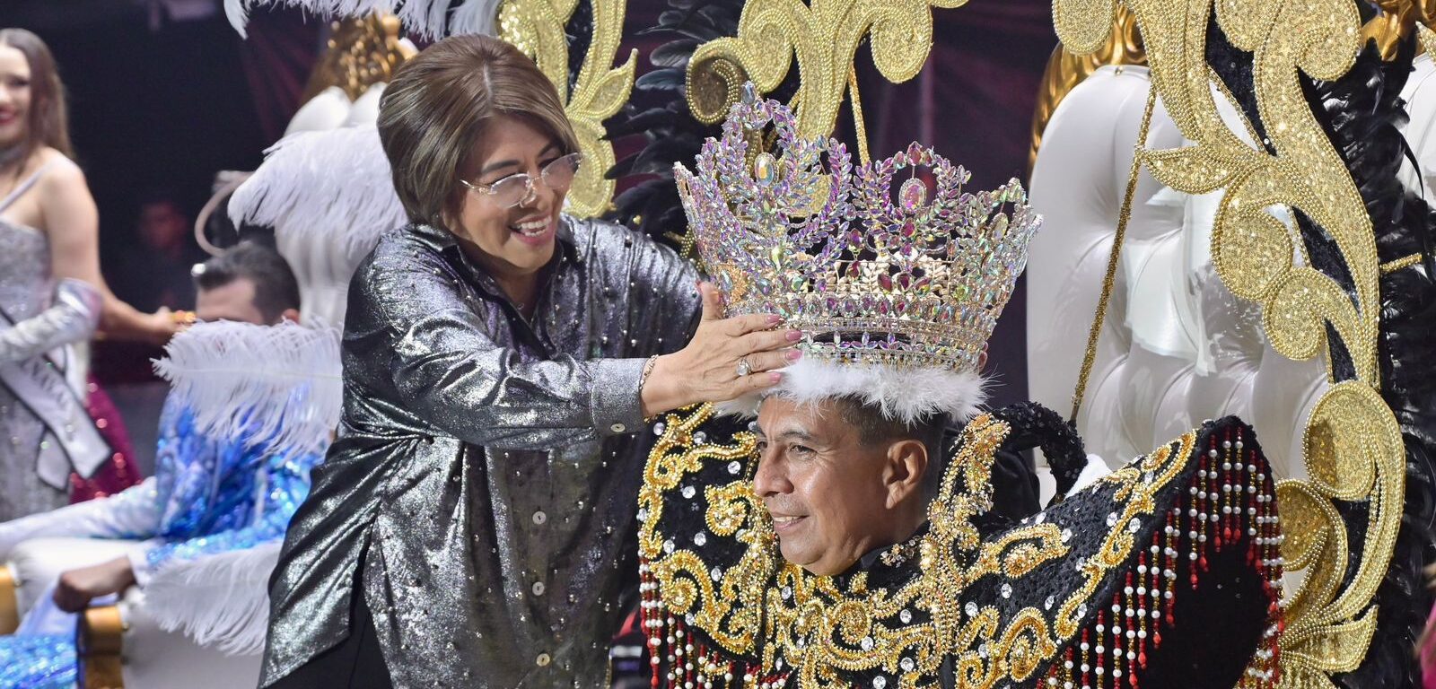 Ataviado con un majestuoso traje en tonos negros y dorados, “Nayo I” fue coronado por la alcaldesa de Veracruz, Rosa María Hernández Espejo, y recibió el cetro de la reina electa 2026, Fernanda Pumar, en un acto solemne que contó con la presencia de la secretaria de Cultura, Xóchitl Molina González.