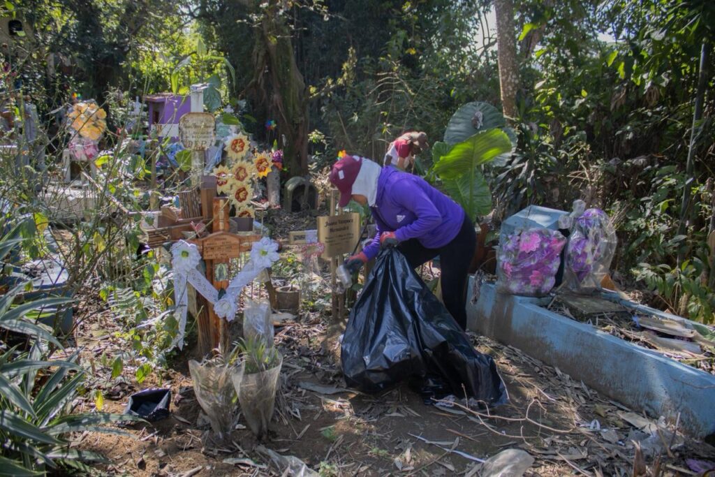 Desde los primeros minutos, cuadrillas integradas por vecinos y trabajadores municipales desarrollaron labores de limpieza general, retiro de residuos acumulados y acondicionamiento de zonas que requerían atención prioritaria. Se intervino de manera especial la zona baja del panteón municipal, una de las áreas con mayor descuido, donde se realizaron trabajos intensivos para dignificar el entorno y prevenir la proliferación del mosco transmisor del dengue.