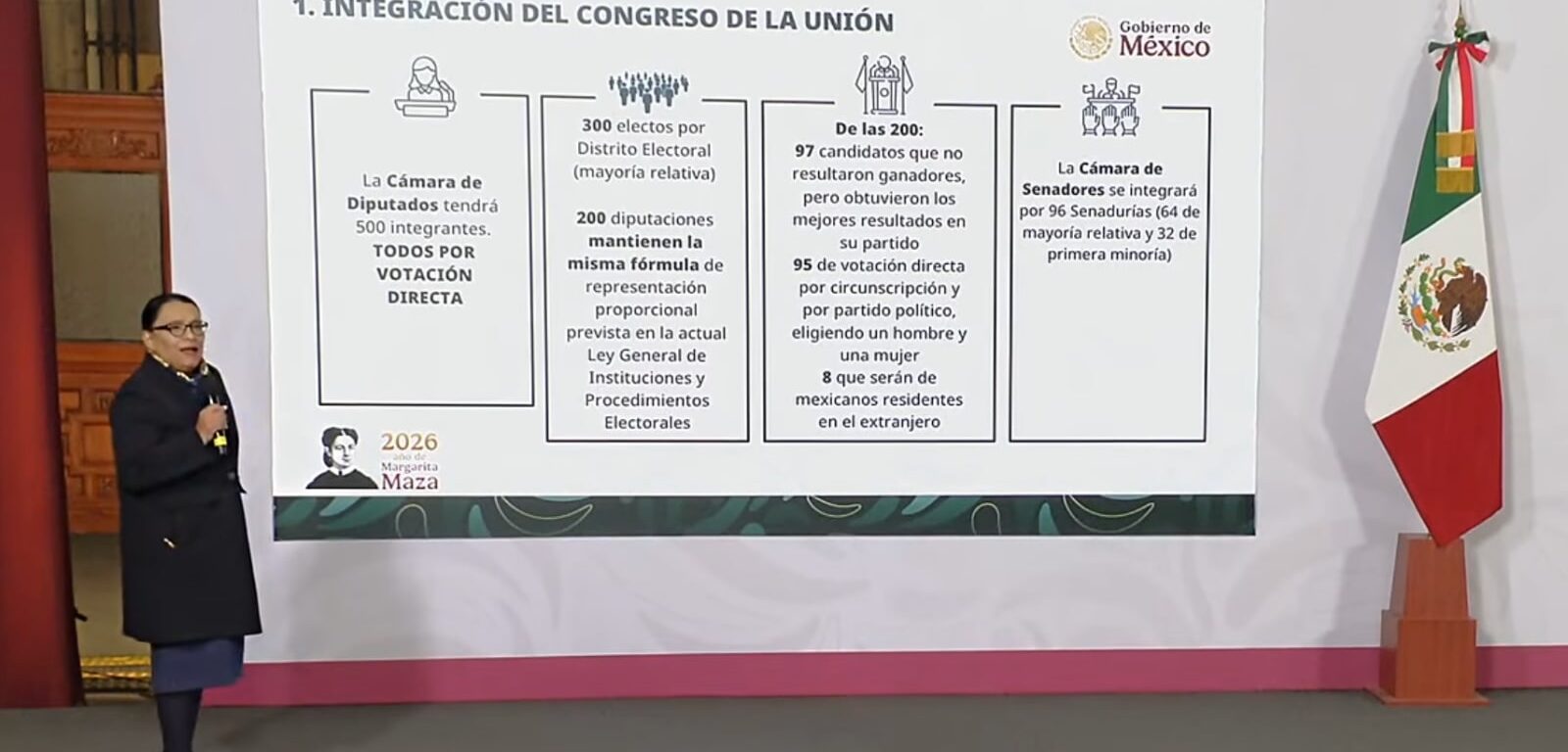 “Sobre el Congreso de la Unión, la Cámara de Diputados tendrá 500 integrantes todos por votación directa, de ellos 30 electos por distrito electoral. Se propone un decremento del 25% del costo de las elecciones con una reducción a los recursos del INE, partidos políticos, OPLES y tribunales electorales, también se disminuyen los bonos y consejeros del INE”, señaló la titular de Gobernación.
