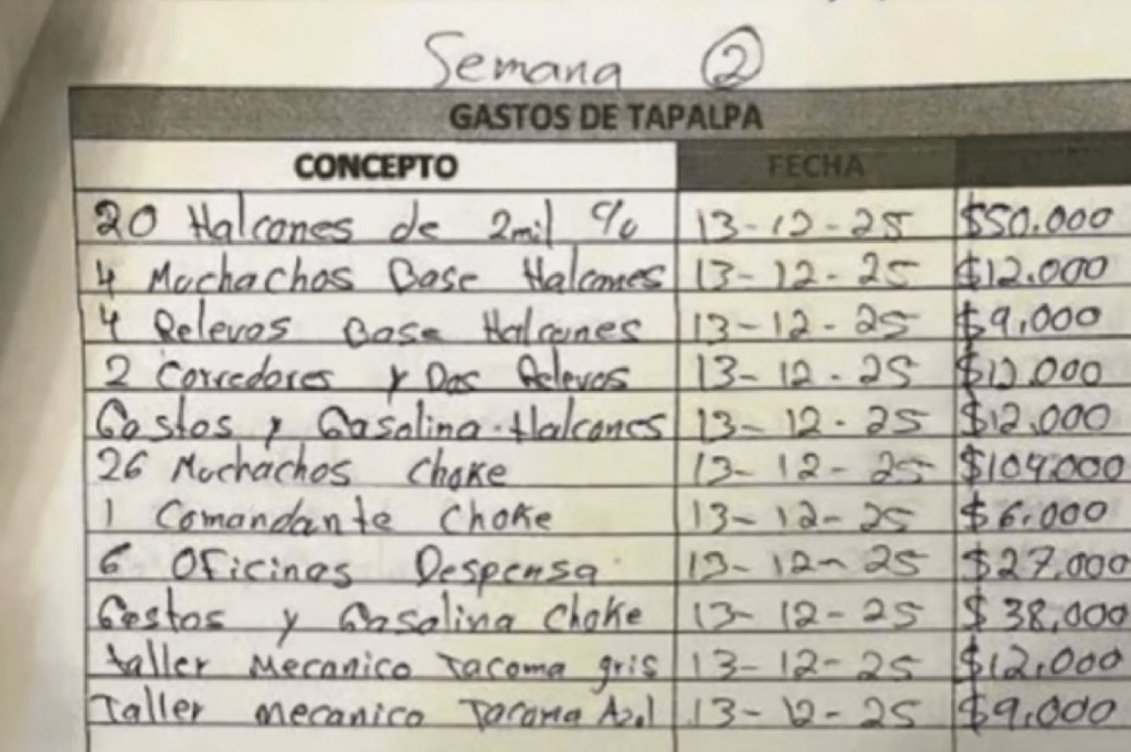 Los gastos también contemplaban gasolina para vigilantes y sicarios, renta de una base para halcones, oficinas para el grupo armado, despensas, reparaciones mecánicas y otros gastos generales.