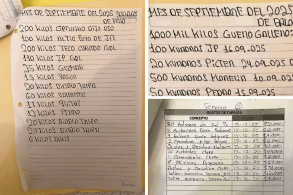 Los archivos, elaborados tanto a mano como en computadora, fueron localizados en una cabaña que presuntamente era utilizada como refugio por Nemesio Rubén Oseguera Cervantes, alias “El Mencho”. En ellos se detallan ingresos, gastos operativos y distribución de cargamentos de droga, incluidos envíos de hasta mil kilos de cocaína y metanfetamina (“cristal”).