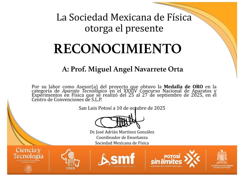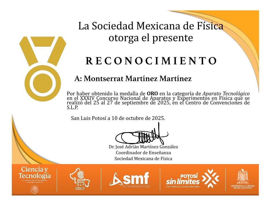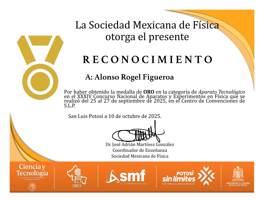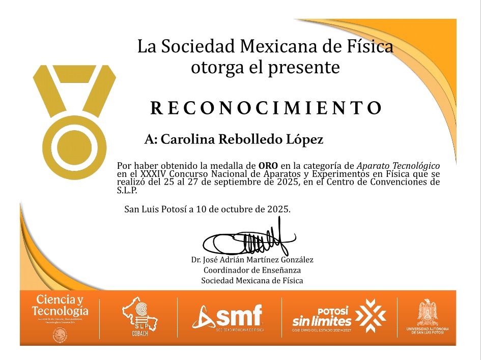 Esto, luego de haber obtenido medalla de oro en el XXXIV Concurso Nacional de Aparatos y Experimentos en Física, realizado del 25 al 27 de septiembre de 2025 en el Centro de Convenciones de San Luis Potosí.