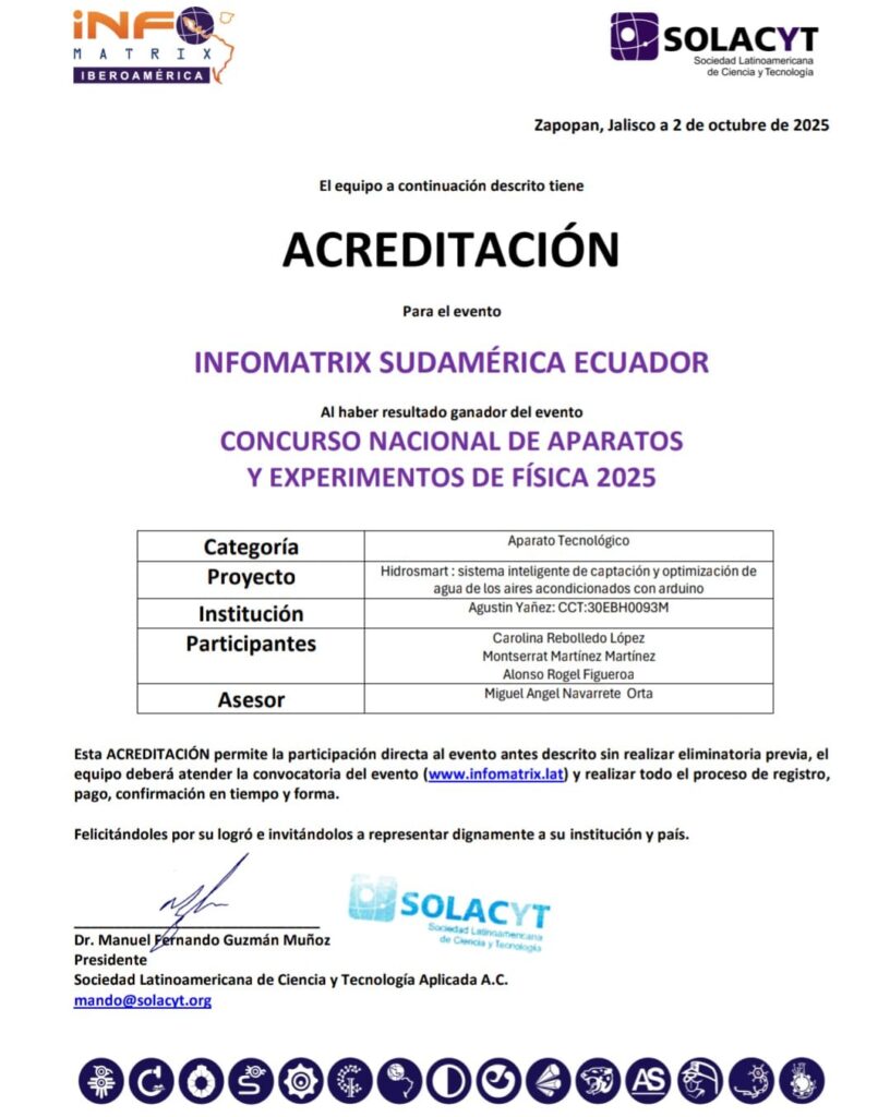 El equipo está integrado por Carolina Rebolledo López, Montserrat Martínez Martínez y Alonso Rogel Figueroa, quienes desarrollaron el proyecto “Hidrosmart: sistema inteligente de captación y optimización de agua de los aires acondicionados con Arduino”, bajo la asesoría del profesor Miguel Ángel Navarrete Orta.