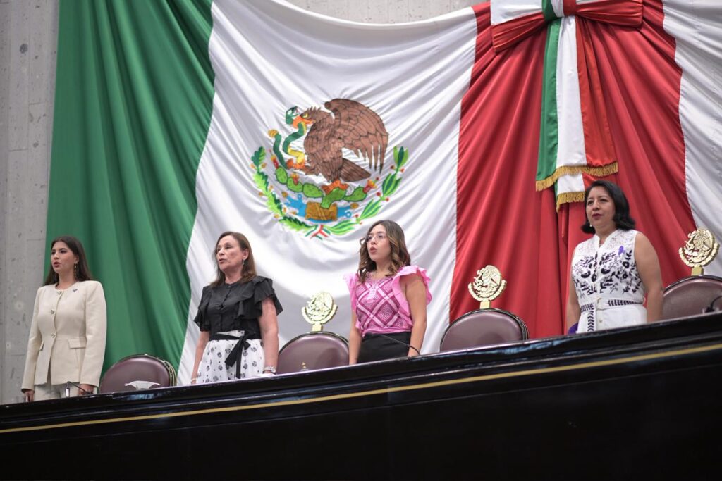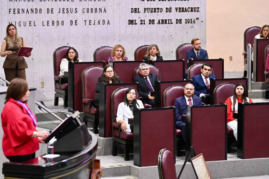 En el Recinto Oficial del Palacio Legislativo y con la asistencia de integrantes del gabinete estatal, presidentas y presidentes municipales, representantes de organismos autónomos y de organizaciones civiles y público en general, la presidenta de la Mesa Directiva, diputada Naomi Edith Gómez Santos, instruyó a las comisiones de cortesía recibir a las titulares de los poderes Ejecutivo y Judicial y a la condecorada.