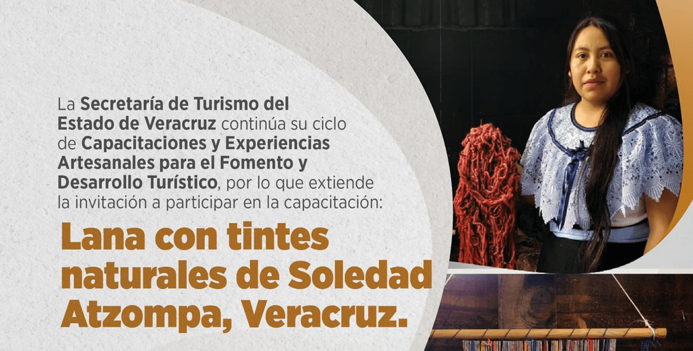 Xalapa, Ver., sábado 07 de marzo de 2026.- La Secretaría de Turismo (SECTUR) continúa el ciclo de Capacitaciones y Experiencias Artesanales para el Fomento y Desarrollo Turístico, por lo que invita a participar en el curso Lana con tintes naturales de Soledad Atzompa, Veracruz; el viernes 27 de marzo a las 11:00 horas.