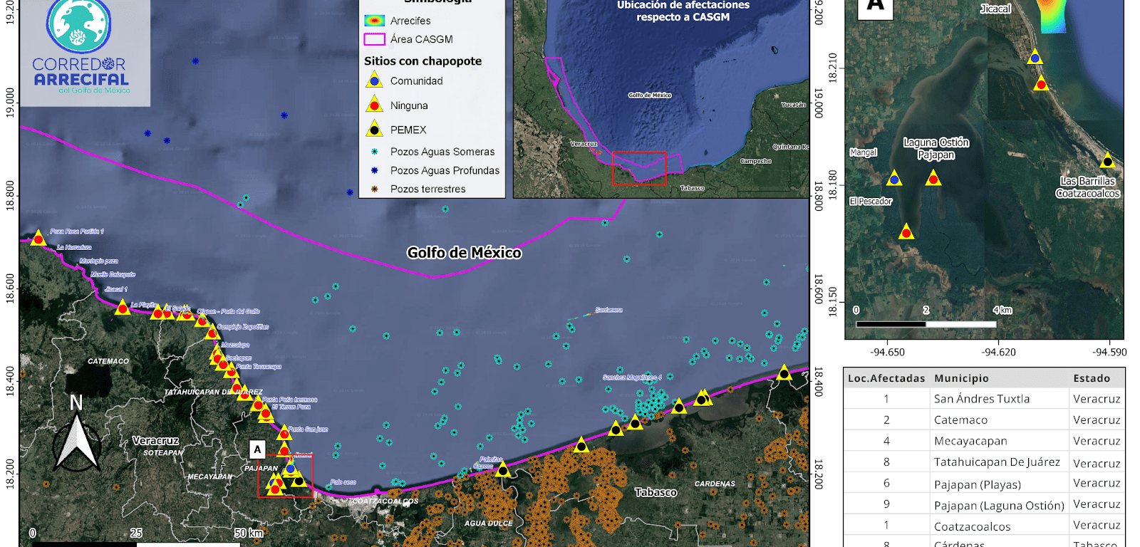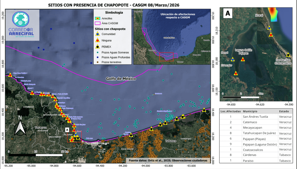 09 de marzo de 2026.- A una semana de los primeros arribos de chapopote en las playas del sur de Veracruz y norte de Tabasco, la Red Corredor Arrecifal del Golfo de México, junto con las comunidades locales, evidencia la gravedad de la situación. En el sur de Veracruz se reporta que todas las playas de los municipios Tatahuicapan, Mecayapan y Pajapan están afectadas. Además, el petróleo ingresó a la laguna del Ostión (Pajapan), impactando a las nueve comunidades que dependen de ella. También se ha registrado presencia de chapopote en Carrizal, municipio de Catemaco, y en menor medida en La Barra de Sontecomapan y Roca Partida, comunidades del litoral de la Reserva de la Biosfera de Los Tuxtlas. Incluso en Punta Puntilla, una comunidad más al norte de la reserva, se encontró una tortuga cubierta de hidrocarburos. En Tabasco, se reportó una mayor presencia de chapopote en las zonas de Paraíso y Sánchez Magallanes, arrastrado hasta la costa por el derrame ocurrido en el mar. Hasta este momento, se contabilizan 39 localidades afectadas en 230 km de litoral [mapa 1], de las cuales 30 se ubican en 100 km del sur de Veracruz y 9 en un total de 70 km en Tabasco.