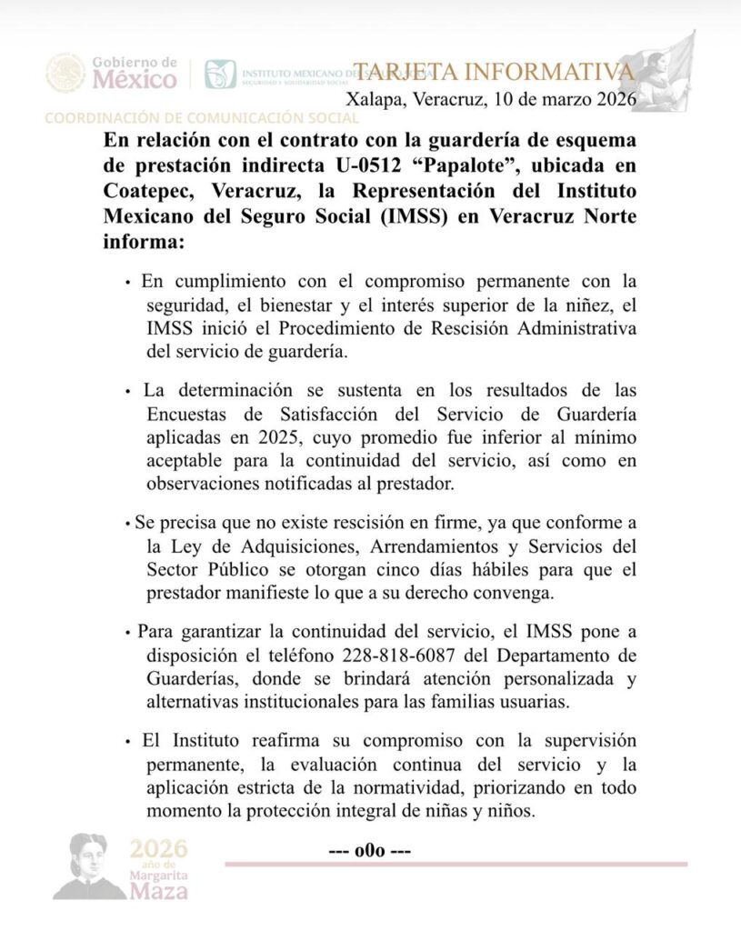 La Representación del Instituto Mexicano del Seguro Social (IMSS) en Veracruz Norte informó que inició el Procedimiento de Rescisión Administrativa del contrato con la guardería de esquema de prestación indirecta U-0512 “Papalote”, ubicada en el municipio de Coatepec.