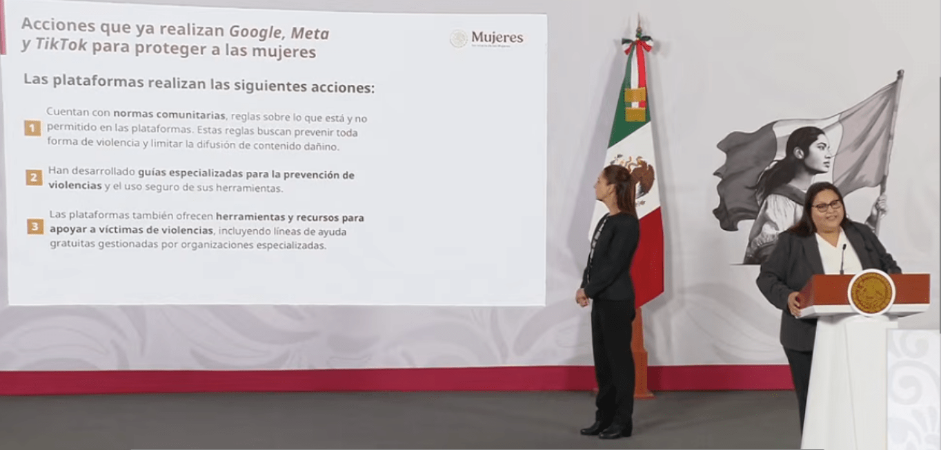 Las medidas fueron presentadas por la secretaria de las Mujeres, Citlalli Hernández, quien explicó que el gobierno federal sostuvo reuniones con empresas tecnológicas como Google, Meta Platforms y TikTok para establecer un protocolo de colaboración orientado a prevenir, denunciar y atender la violencia digital en contra de las mujeres.