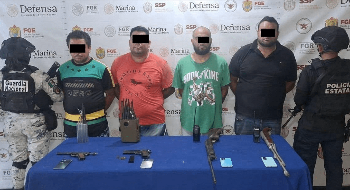 En Coatzacoalcos fueron aprehendidos cuatro hombres por delitos contra las instituciones de seguridad pública y portación ilegal de armas de fuego, a quienes se les aseguraron dos armas cortas, dos rifles de postas, un cargador, cartuchos útiles, teléfonos móviles, inhibidores de señal, radios de comunicación y un automóvil sin reporte de robo.