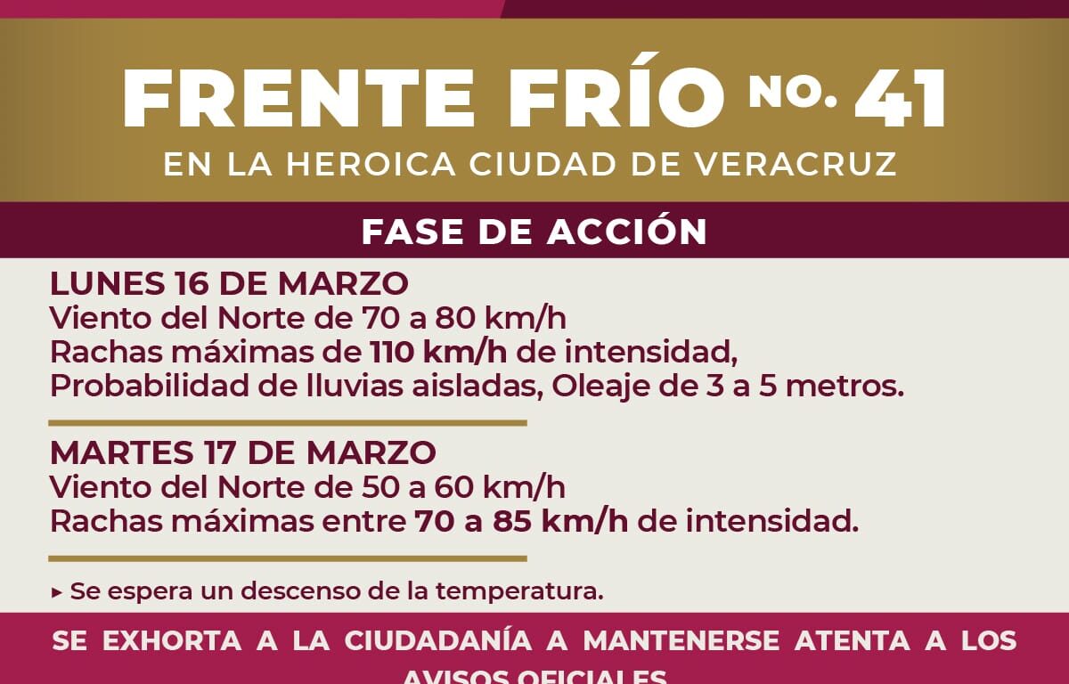 Ante el ingreso del Frente Frío 41 y la presencia de viento del norte en la ciudad de Veracruz, la Dirección de Protección Civil Municipal exhorta a la ciudadanía a extremar precauciones, mantenerse informada sobre la evolución del clima y evitar riesgos en zonas expuestas al viento, oleaje o lluvias. Se prevén vientos de 70 a 80 km/h con rachas de hasta 110 km/h.