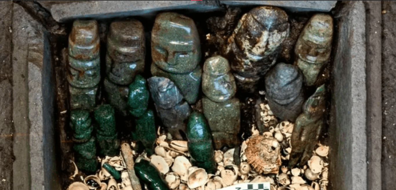 Las ofrendas fueron encontradas dentro de cofres de piedra llamados tepetlacalli, que permanecieron enterrados bajo enormes esculturas de cabezas de serpiente que pueden pesar hasta una tonelada.