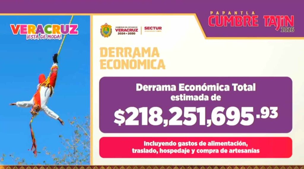 Xalapa, Ver.- La edición 2026 del Cumbre Tajín 2026 consolidó su impacto económico en el norte del estado al registrar una derrama estimada de 218 millones 251 mil 695.93 pesos, de acuerdo con datos oficiales del Gobierno de Veracruz y la Secretaría de Turismo, presentados este lunes por la gobernadora Rocío Nahle García.