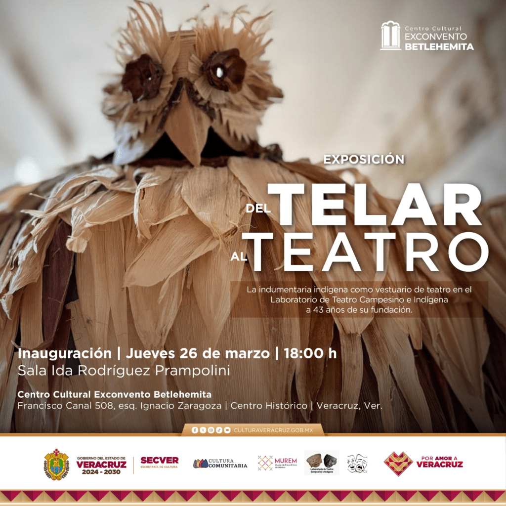 Xalapa, Ver., miércoles 25 de marzo de 2026.- La Secretaría de Cultura de Veracruz (SECVER) invita a la inauguración de la exposición Del telar al teatro. Laboratorio de teatro campesino e indígena, que se llevará a cabo el jueves 26 de marzo en el Centro Cultural Exconvento Betlehemita, en Veracruz.