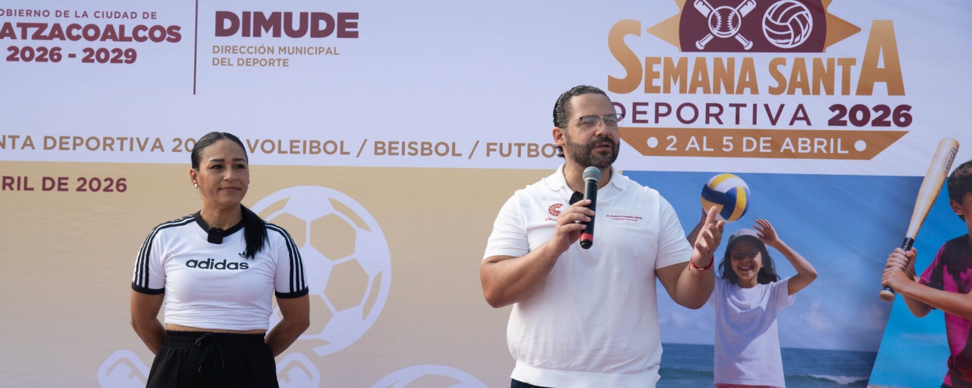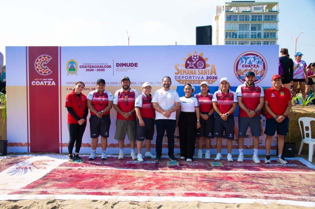 Coatzacoalcos, Ver., 2 de abril de 2026.– Con el objetivo de fomentar la convivencia familiar y la sana competencia, el presidente de Coatzacoalcos, Pedro Miguel Rosaldo García, junto a la directora Municipal del Deporte, Tania Eunice Pérez Sánchez, dieron el arranque a la Semana Santa Deportiva 2026, que contempla torneos de voleibol, futbol y beisbol de playa.