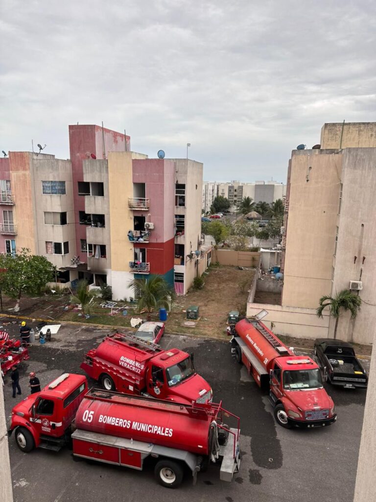 Elementos del Heroico Cuerpo de Bomberos y de Protección Civil municipal de Veracruz realizan labores de enfriamiento en un edificio de departamentos del fraccionamiento Rincón de Palma Real, luego del incendio provocado por una explosión al interior de una de las viviendas, que se extendió al resto del inmueble y fue controlado tras la pronta intervención de las corporaciones.