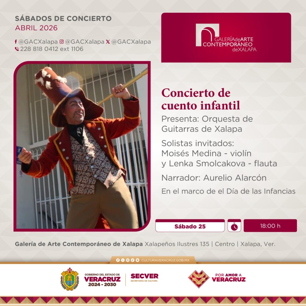 Xalapa, Ver., jueves 09 de abril de 2026.- Las secretarías de Cultura y de Educación de Veracruz, invitan a los sábados de concierto, los días 11 y 25 de abril a las 18:00 horas, en la Galería de Arte Contemporáneo de Xalapa. La entrada es gratuita.