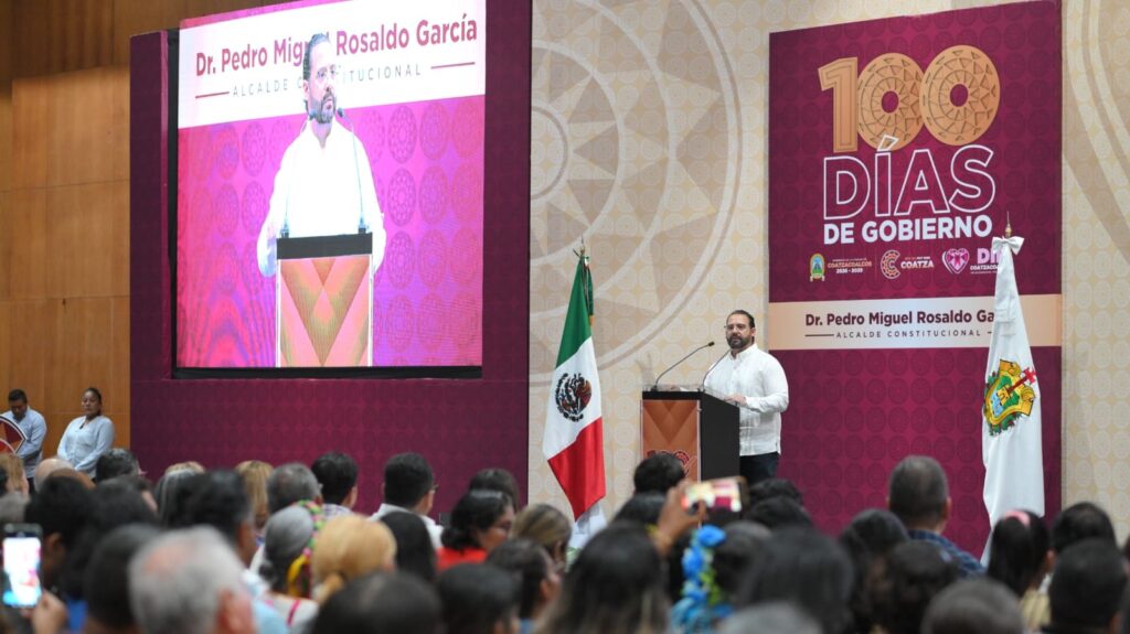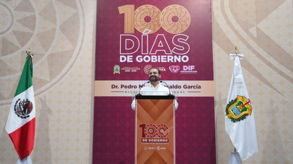 Coatzacoalcos, Ver., 11 de abril de 2026.- Al rendir su informe de los primeros 100 días de Gobierno, el alcalde de Coatzacoalcos, Pedro Miguel Rosaldo García, aseguró que su administración ha alcanzado una productividad 250% superior al promedio de las últimas cuatro administraciones, destacando que “nos empieza a ir muy bien”.
