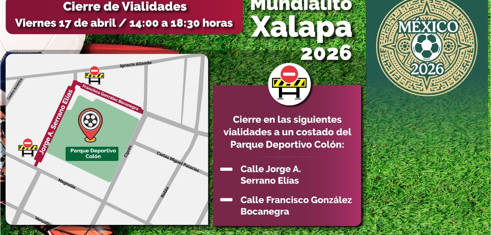 Xalapa, Ver., 15 de abril de 2026.- Ante el inicio del Mundialito Xalapa 2026, se informa a la población que el viernes 17 de abril habrá cortes a la circulación vial en la zona del Parque Deportivo Colón, por lo que se exhorta a automovilistas tomar rutas alternas y anticipar sus traslados.