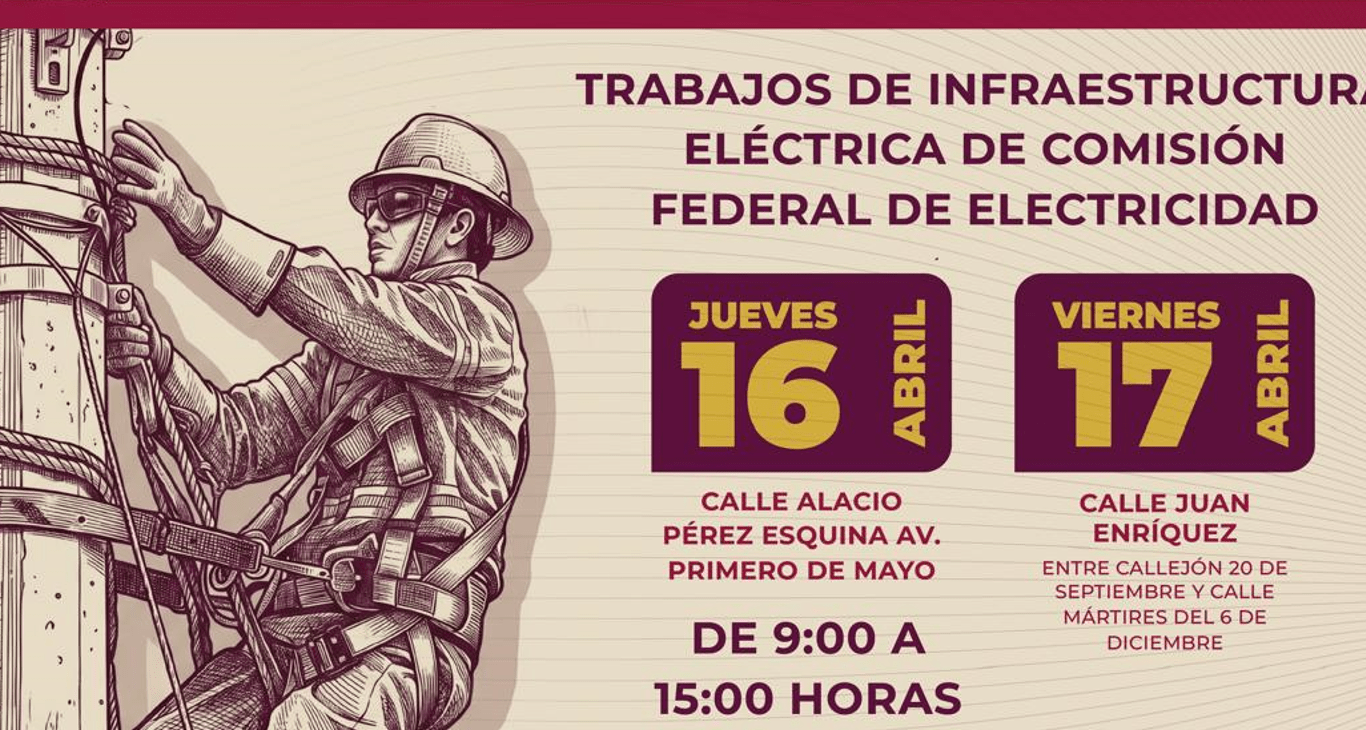 Asimismo, se informa que, derivado de estos trabajos, la próxima semana la CFE realizará un corte programado de energía eléctrica en la zona para la sustitución de transformadores y se les avisará oportunamente. Se recomienda a la ciudadanía tomar las precauciones necesarias y mantenerse informada a través de los canales oficiales.