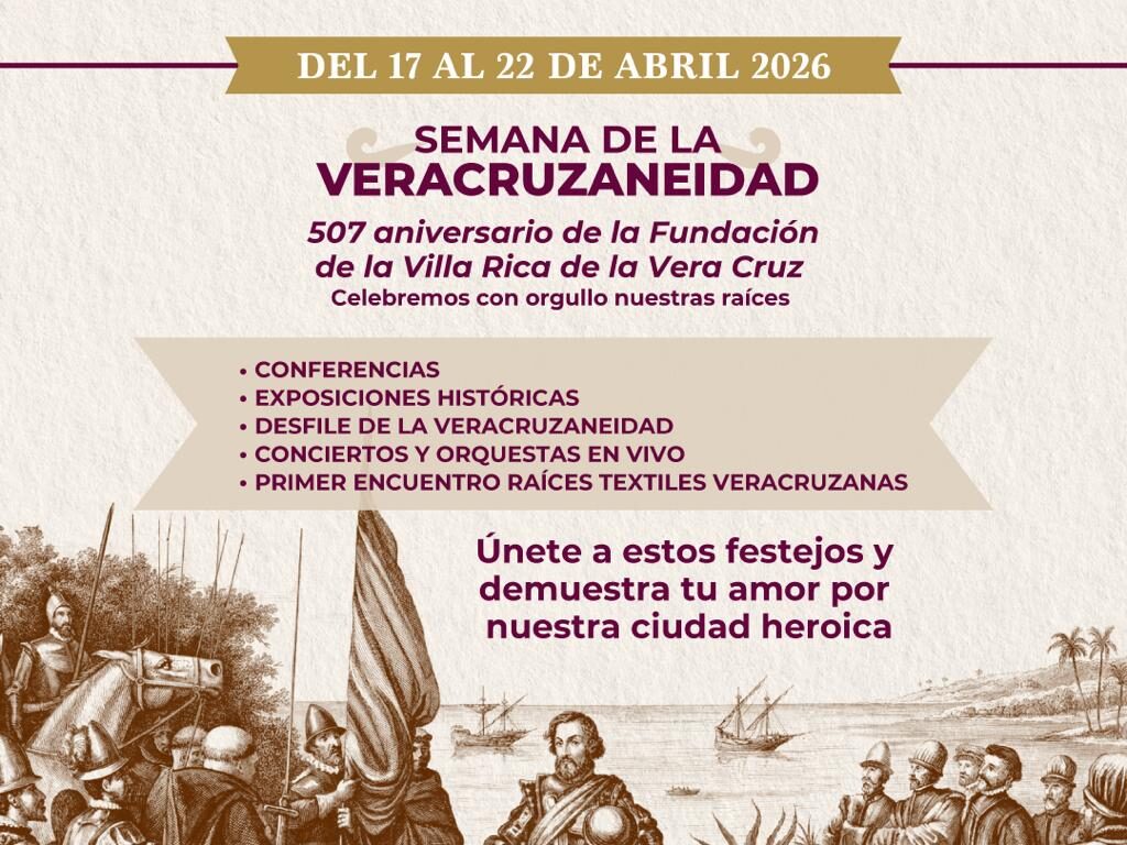 El programa culmina el 22 de abril con la Fiesta de la Veracruzaneidad, que incluye corredor gastronómico, desfile y música viva, consolidando una celebración que honra el origen histórico de la ciudad y refrenda el compromiso de preservar sus tradiciones con una visión incluyente y contemporánea.