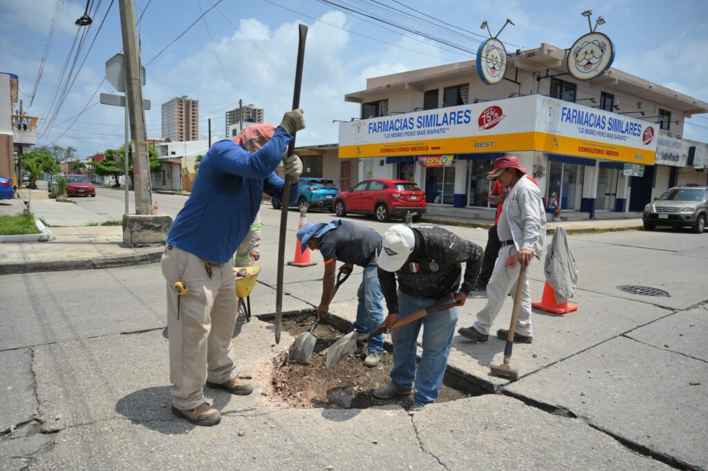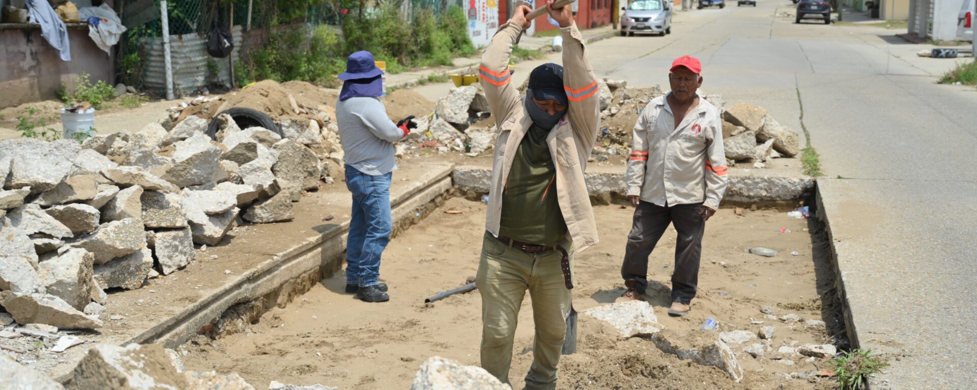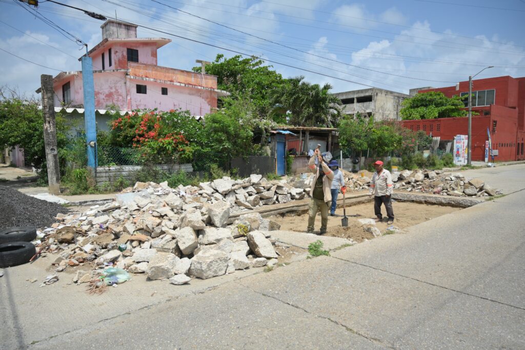 En la calle Juan Escutia, entre Avenida Uno y Ayuntamiento, se realizan trabajos de demolición manual de banquetas deterioradas y en el malecón, a la entrada de Puerto Esmeralda, se construye un muro de contención para reforzar la zona y prevenir afectaciones por erosión.