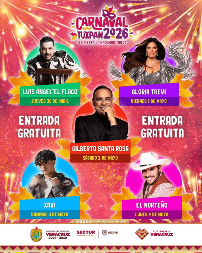 Xalapa, Ver., martes 21 de abril de 2026.– Con una cartelera artística de primer nivel y actividades para toda la familia, la Secretaría de Turismo invita a disfrutar del Carnaval Tuxpan 2026, La fiesta la hacemos todos, que se llevará a cabo del 30 de abril al 04 de mayo.