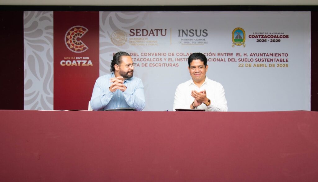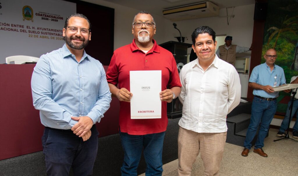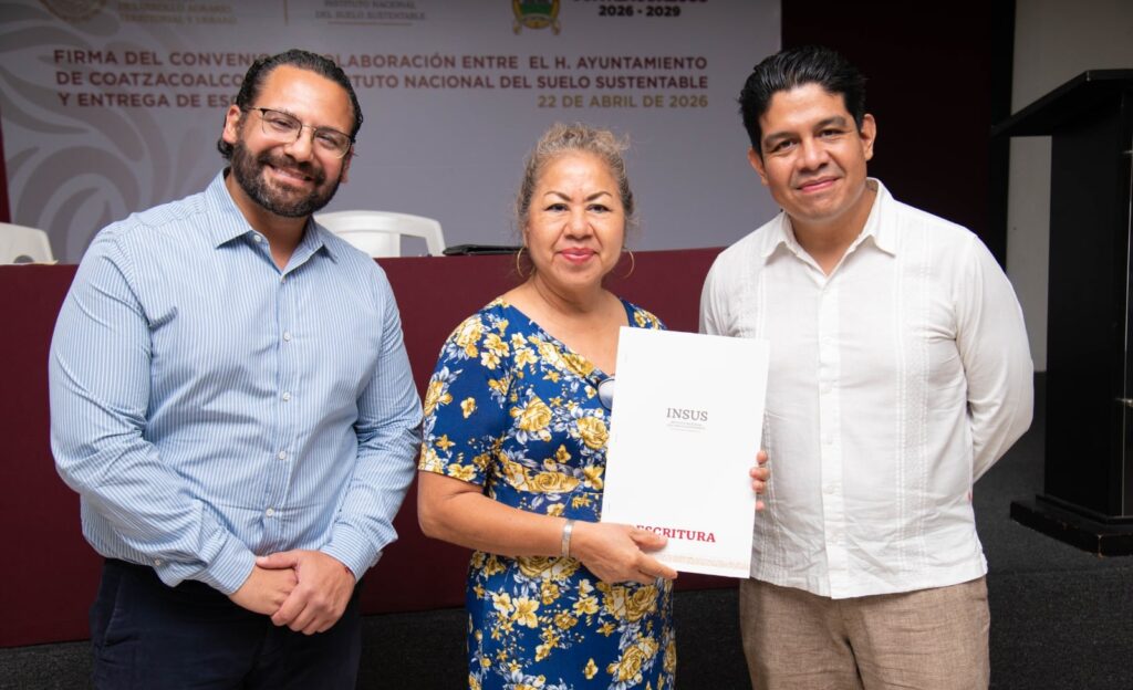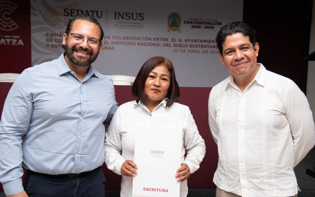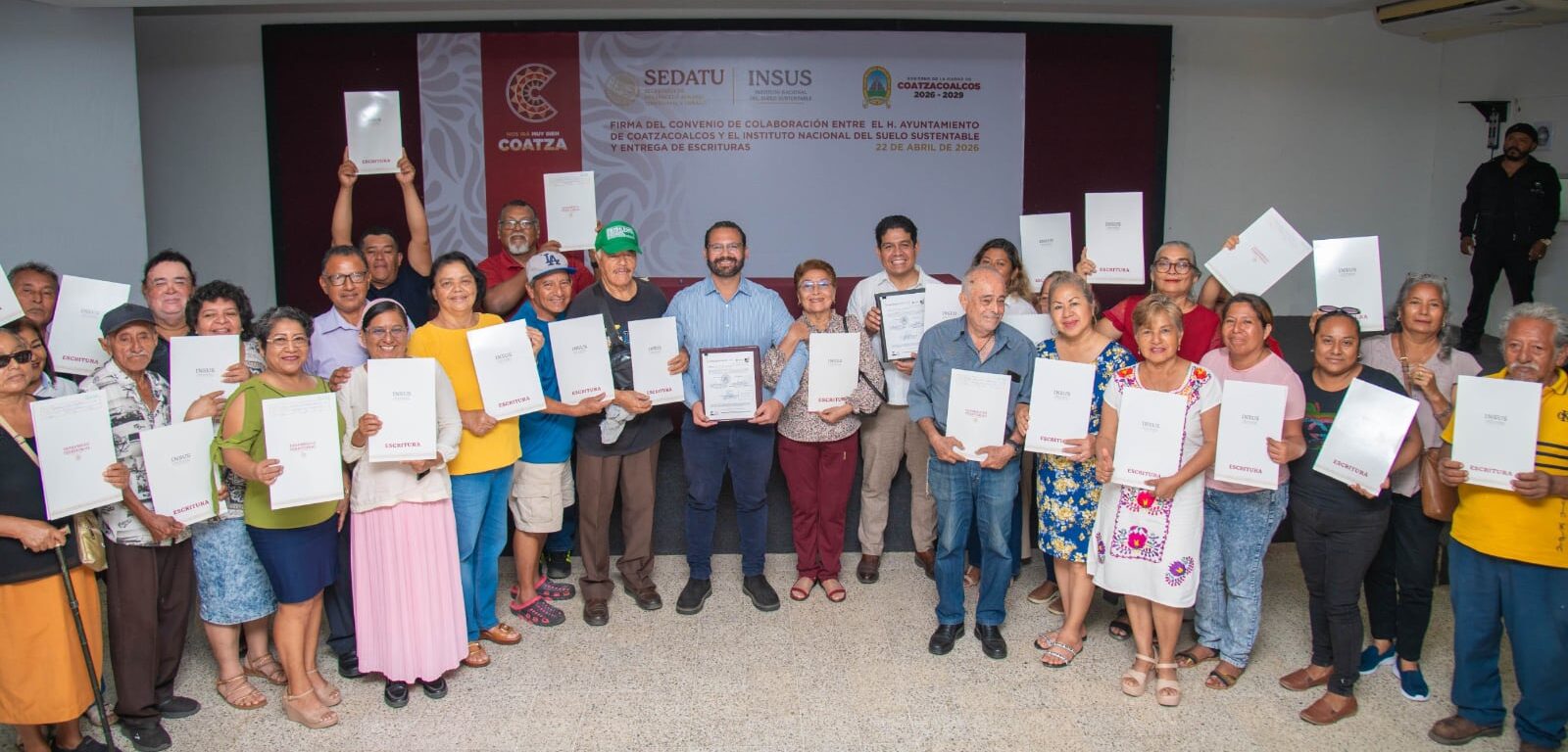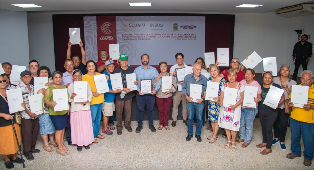 Coatzacoalcos, Ver., 22 de abril de 2026.- Un total de 31 familias de Coatzacoalcos y Villa Allende recibieron sus escrituras, algunas tras más de dos décadas de espera, como parte de una estrategia de regularización impulsada por el Gobierno Municipal en coordinación con el Instituto Nacional del Suelo Sustentable (INSUS) que incluyó la firma de colaboración entre ambas dependencias.