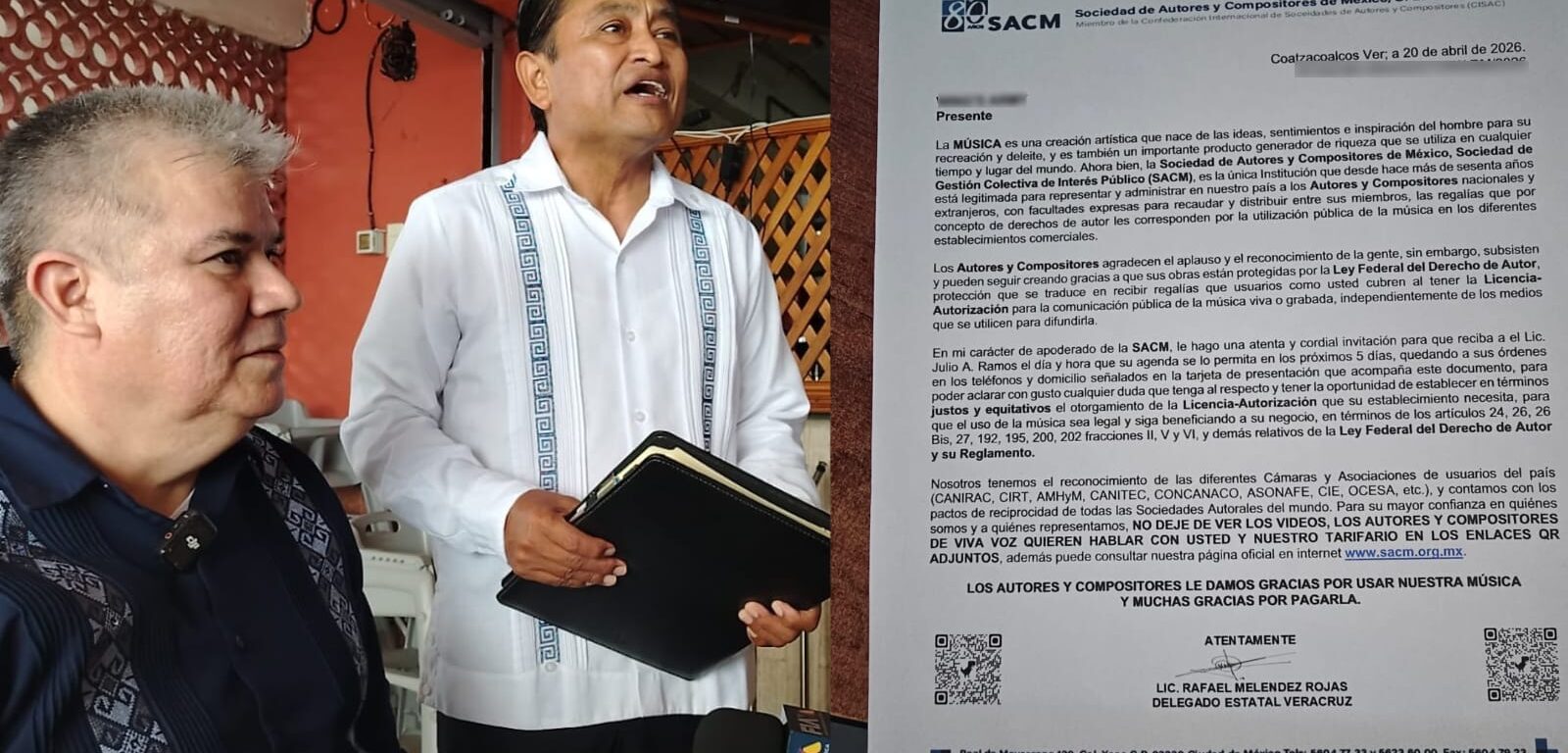 Increíblemente, hace unos días llegó una carta a varios (sino es que a todos) los restaurantes de Coatzacoalcos, avalada supuestamente por la Sociedad de Autores y Compositores de México, firmada por el delegado estatal Rafael Meléndez Rojas.