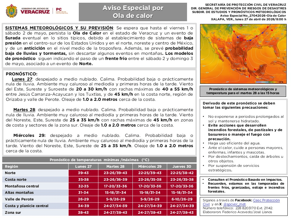Xalapa, Ver., 27 de abril de 2026. La Secretaría de Protección Civil informó que la ola de calor continuará afectando al estado de Veracruz hasta el viernes 1 o sábado 2 de mayo, por lo que llamó a la población a tomar medidas preventivas ante las altas temperaturas y el riesgo de incendios forestales.