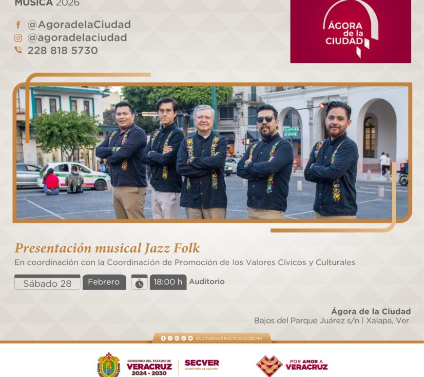 Xalapa, Ver., jueves 26 de febrero de 2026.- La Secretaría de Cultura de Veracruz, en colaboración con la Coordinación de Promoción de los Valores Cívicos y Culturales de la Secretaría de Gobierno, invita al concierto gratuito de la agrupación Jazz Folk, el sábado 28 a las 18:00 horas, en el Auditorio del Ágora de la Ciudad. Contará con la participación especial de la cantante Messe … Continuar leyendo Invita SECVER a presentación de Jazz Folk en el Ágora