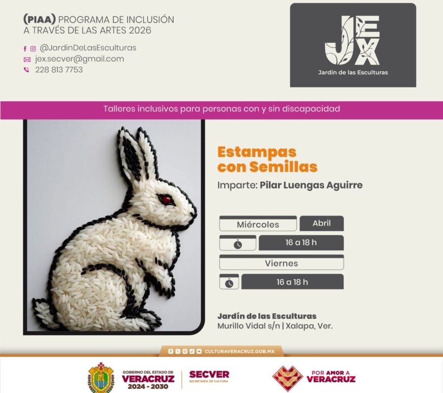 Xalapa, Ver., jueves 09 de abril de 2026.- La Secretaría de Cultura de Veracruz (SECVER) invita a participar en los talleres inclusivos dirigidos a personas con y sin discapacidad, que se realizarán durante abril en el Jardín de las Esculturas de Xalapa. Todas las actividades son gratuitas. Como parte del Programa de Inclusión a través de las Artes (PIAA), la dependencia ofrece una serie de talleres … Continuar leyendo Promueve SECVER talleres con perspectiva de inclusión social
